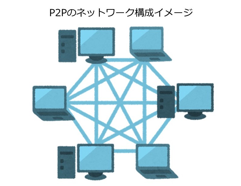 サーバーを介さず、ユーザー同士(ノード同士)が直接通信する方式。分散型で耐障害性が高いのが特徴。