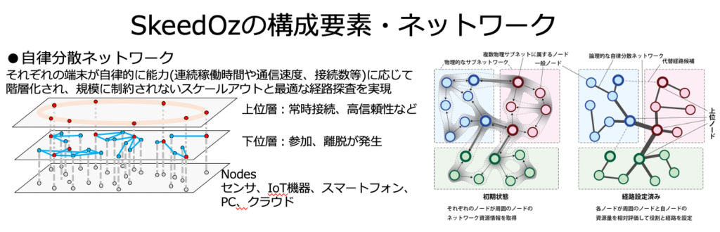 SkeedOzは、IoT時代に必要な自律分散ネットワーク基盤を中核に据え、センサー情報の収集や制御信号の伝達を効率的に行う仕組みです。
